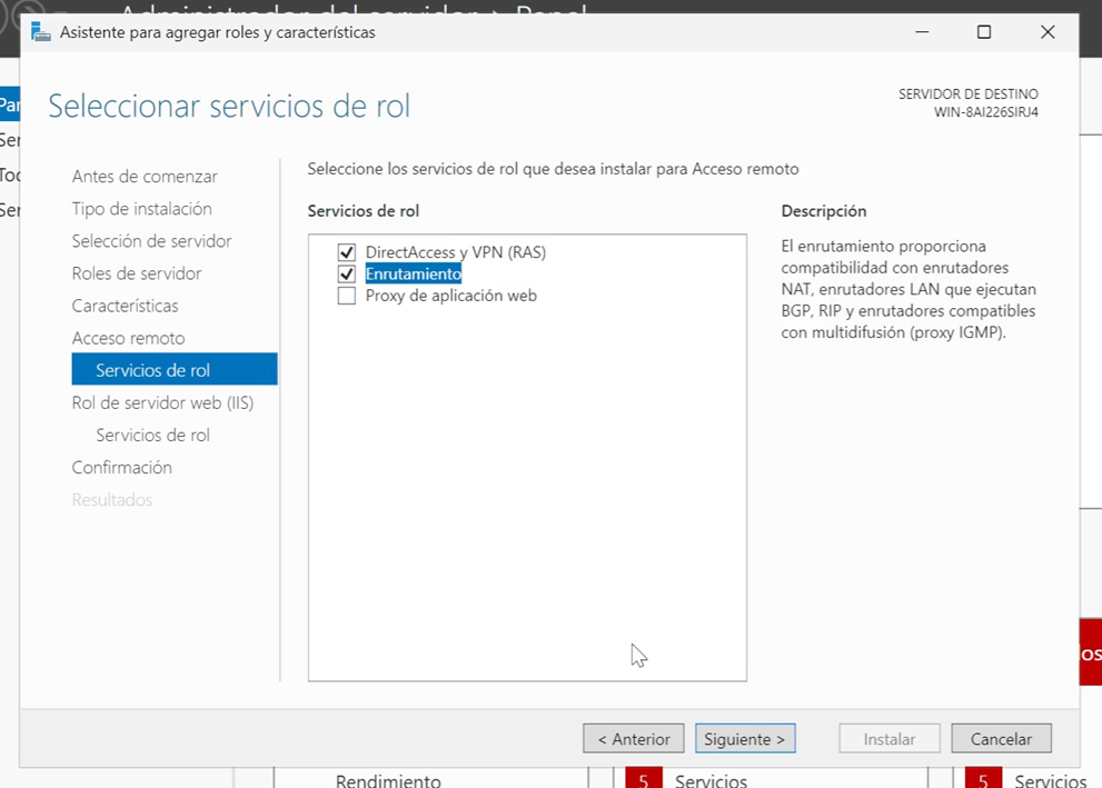 a.Dentro de servicios de rol. Seleccionamos enrutamiento, esto también activara DirectAccess y VPN en Windows server 25 y superior