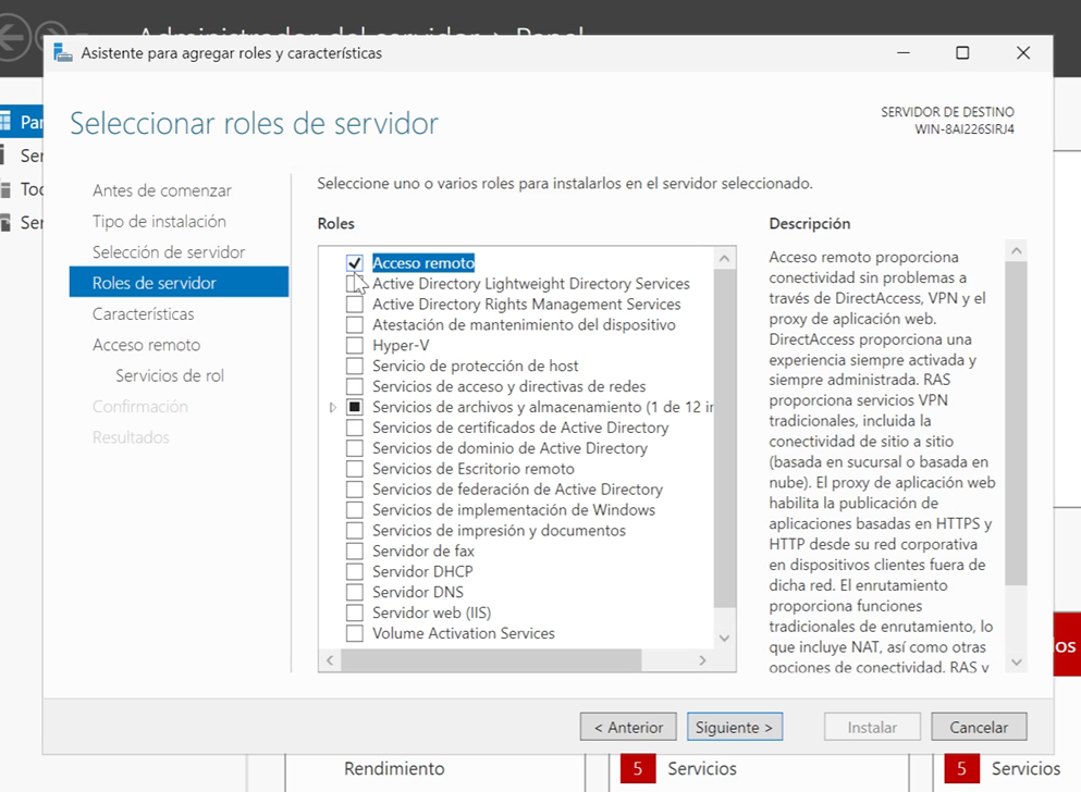 2.Una vez iniciado nuestro servidor, instalamos el rol de Acceso remoto.
