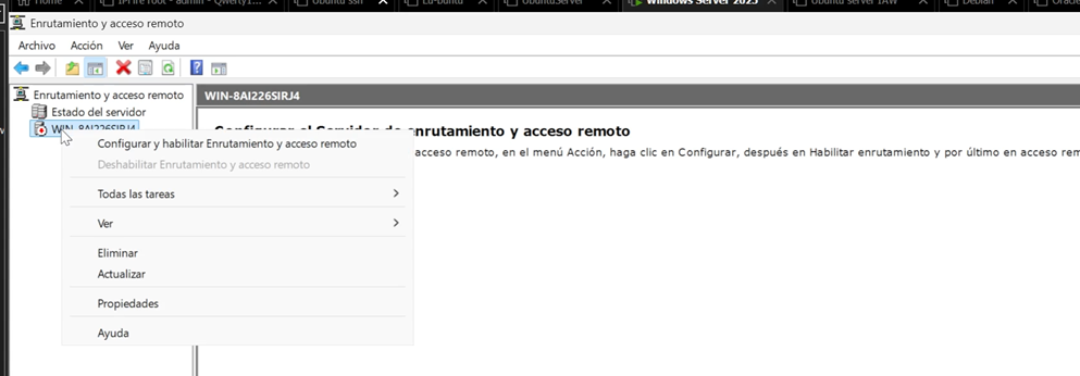 b. Esto nos abrirá la interfaz de enrutamiento y acceso remoto, dentro de esta hacemos click derecho en nuestro servidor y le damos a configurar